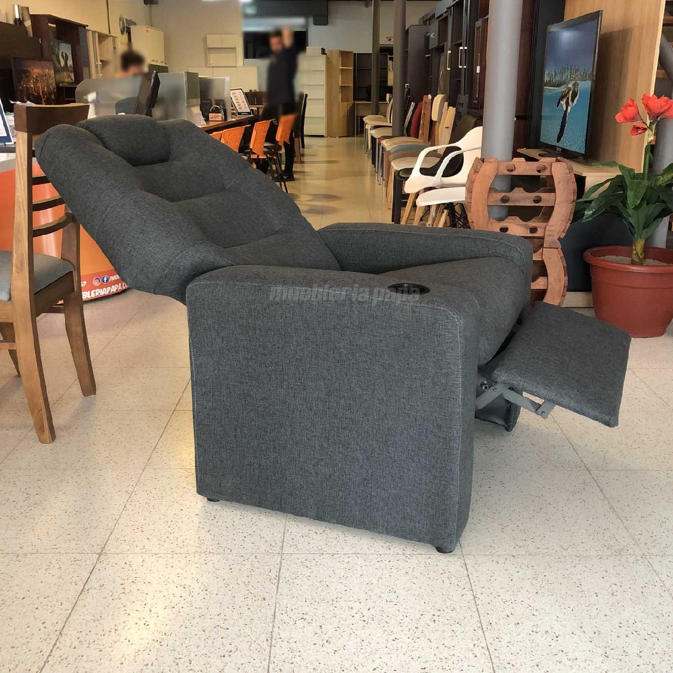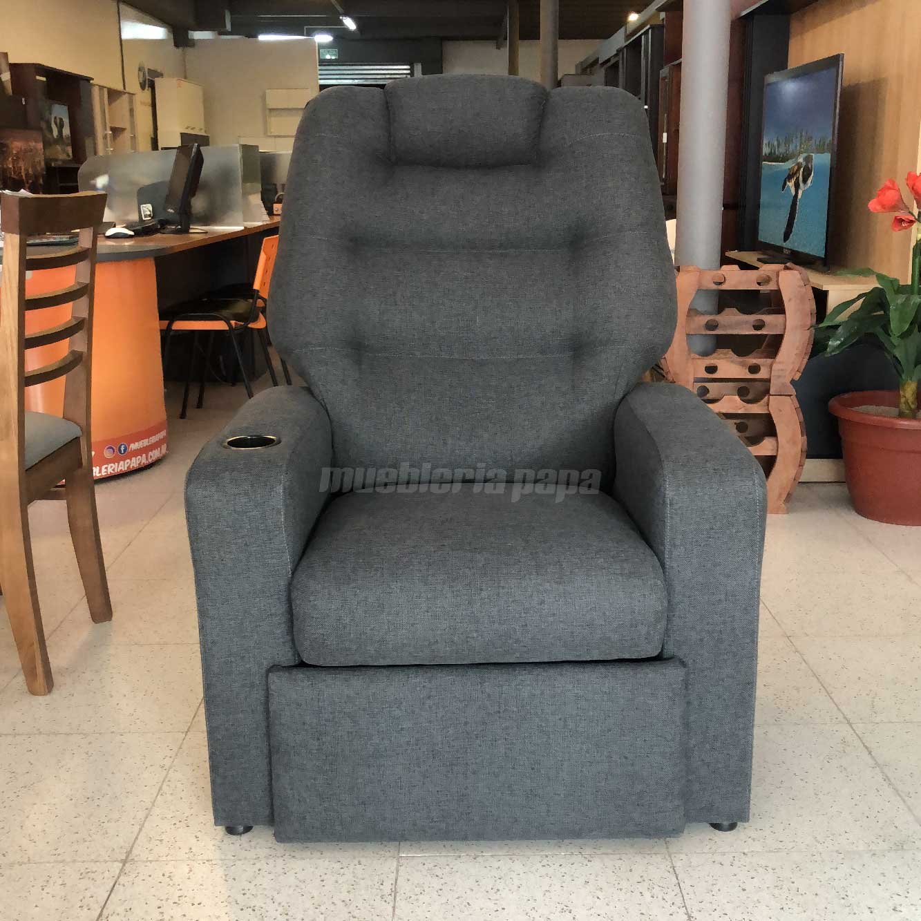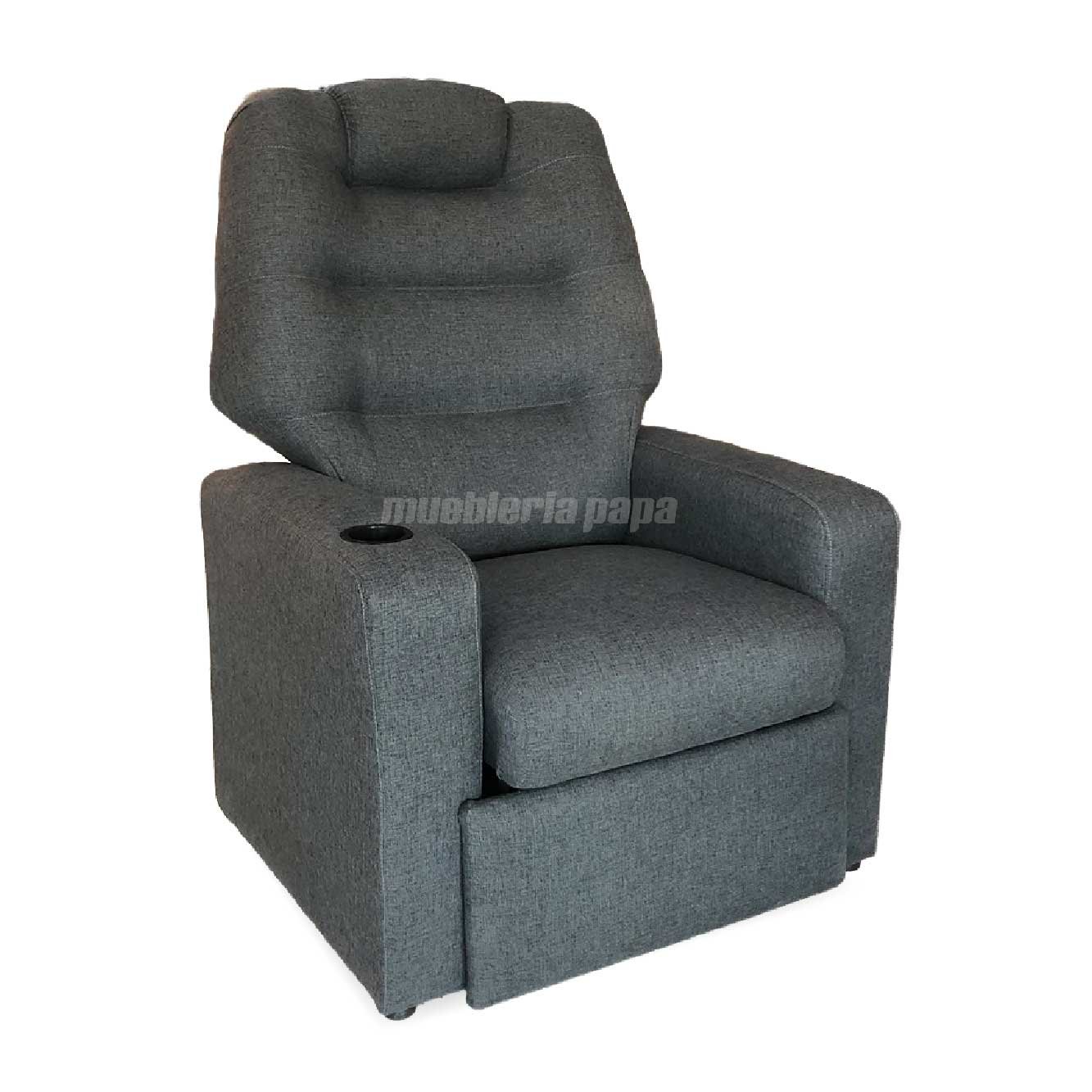 DESCRIPCIÓN: Sillón reclinable tapizado en tela rústica color gris oscuro. ÚNICO CON POSAVASO!