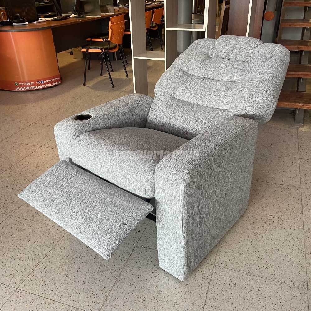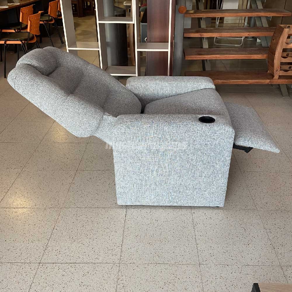DESCRIPCIÓN: Sillón reclinable tapizado en tela rústica color gris oscuro. ÚNICO CON POSAVASO!